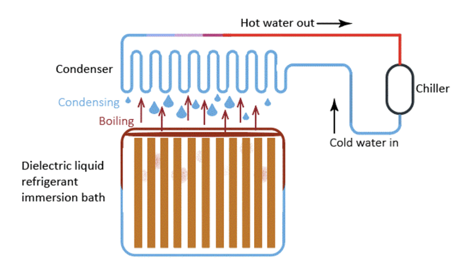 The most common cooling method using two-phase refrigerants is data centre immersion cooling. With immersion cooling, the entire data centre server rack is immersed in a tank of dielectric liquid