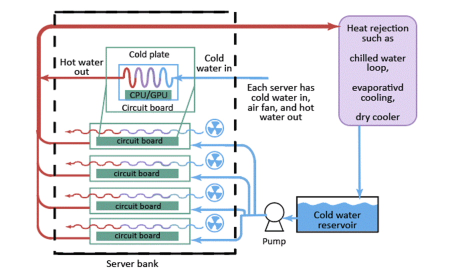 Cold water is circulated through the loop where it absorbs heat from these server components, then flows out of the server to a central hot water return for heat rejection. It’s common for these systems to also use fans as well to provide some degree of air cooling for the other components within the server. Direct to chip (DTC) is a general term for systems like this, where cooling is done at the chip level (as shown above with a plate on the CPU/GPU)
